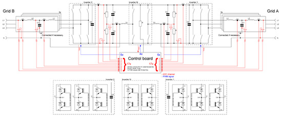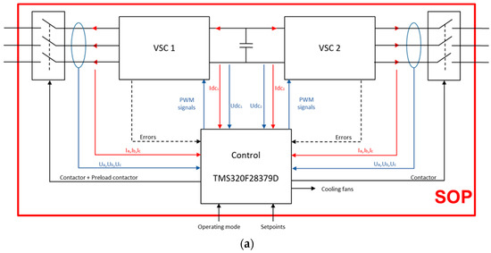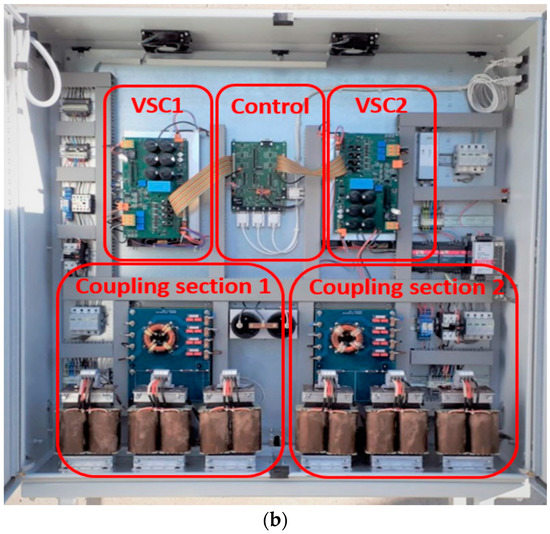 The converter’s main features are: 15 kVA, 230/400 V 3-phase 2-level VSCs based on the PENELER converter [30], LCL output filters, the possibility to add battery storage via a custom DC/DC converter, and CAN and SCI communication protocol available. In Figure 2a, the principle schematic of the SOP is represented, while the SOP electrical cabinet is shown in Figure 2b. The volume of the prototype was intentionally not optimized, in order to facilitate the accessibility to the various components.