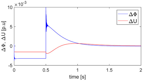 Voltage magnitude (red) and angle (blue) difference between the SOP terminals’ voltages after a “close” operation in “switch mode” (simulation results).