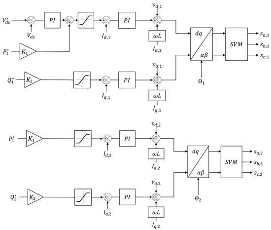 (a) VSC1 control schematic (top); (b) VSC2 control schematic (bottom).