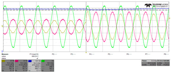 The test results in Figure 6 show the dynamics of the DC link control (blue trace, 250 V/div) performed by the converter VSC1, with a 200% step variation of the real power delivered by the converter VSC2 (yellow signal, 10 A/div). In green, the grid voltage (100 V/div) is shown, while the pink shows the VSC1 current (10 A/div). The SOP is connected to the school grid, which is quite distorted. As can be seen in Figure 6, the dynamic response of the current is shorter than a quarter of the period, while the DC link voltage recovers to its nominal value in about three periods.