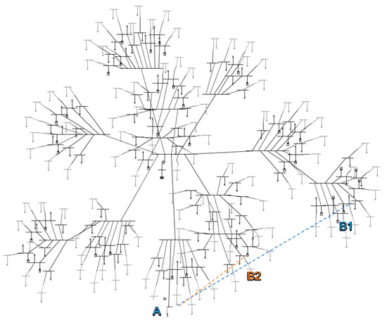 An improvement score considering the average voltage deviations compared to the nominal voltage of each node as well as the loading line/cable (with higher penalties for values approaching the maximum capacity) was introduced. The scores were evaluated and compared for three combinations of load and generation (max/max, max/min and min/max) and with or without SOP. Figure 7 shows a non-geographic example of a generated network.