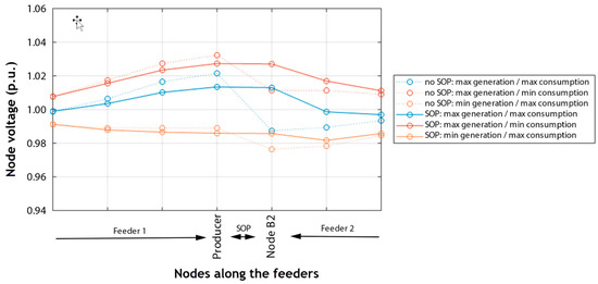 All elements in black are those that exist prior to the addition of an SOP into the LV network. Several positions were investigated for the addition of an SOP (in color). The best-suited solutions are inter-links between nodes A and B1 or A and B2, respectively. Figure 8 shows the resulting voltage profiles for several load/generation combinations with and without an SOP between nodes A and B2. The profiles show that extreme values of node voltages are more widely spread without an SOP than with. This illustrates how the SOP will improve the voltage criterion of our evaluation. A similar behavior can be seen for the current criterion and hence the solution has a positive improvement score. The approach can be repeated on several example networks in order to find networks and SOP locations with the largest improvement potential.