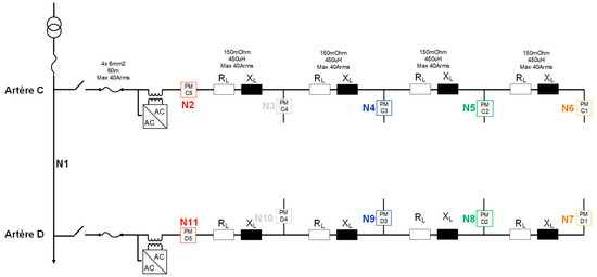 The tests were performed at the GridLab laboratory (HES-SO Valais-Wallis, CH). The GridLab “District” is made of four distribution LV feeders, each rated 40 A. A serial compensator (LVSR) [31] was used to modify the voltage at the beginning of the line. Each section between the prosumers are made of RL circuits reproducing the characteristics of the lines or cables (RL and XL on Figure 9 and Table 3).