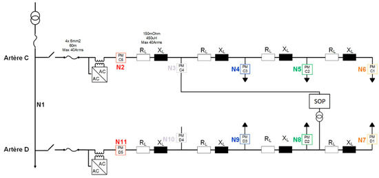 The available access points are C2, C4, D2, and D4. Four different combinations with various amounts of production and injection were tested. In Figure 10, the configuration C4D2 is presented, with the isolation transformer between the feeder D and the SOP.