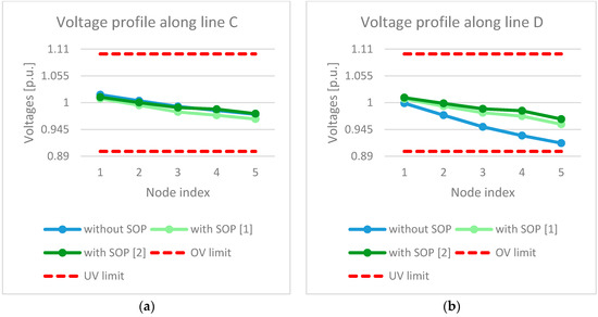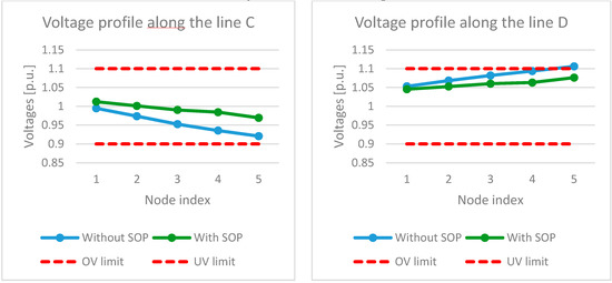 In this situation, the converter at point D1 will not limit its power injection. The key idea is to use the SOP to transmit active power between both feeders, in order to limit the voltage variations. As it can be seen in Figure 11, the SOP helps to maintain the voltage level within acceptable limits. It can be noticed in Table 7, that the current on both feeders is reduced by the action of the SOP. This would not be the case with the commonly used Volt-VAr compensation.