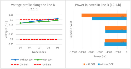 In some cases, the action of the SOP can be seen not only on the voltage level but also on the maximal power injection level. In Figure 13, it can be seen that without the SOP, the voltage at the last point of the feeder (D1) is above the +10% limit and the power injected is limited to below 8 kW by the prosumer converter itself. The SOP helps to keep the voltage within the limits and thus the converter at point D1 can inject up to 10 kW.