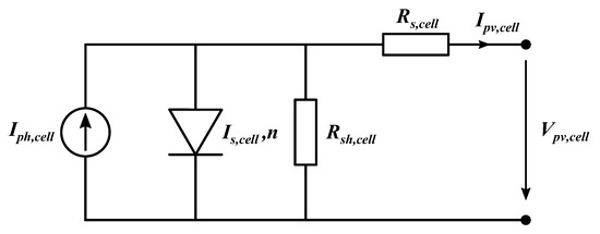 In this work, the Single-Diode Model (SDM) of the photovoltaic cell is adopted. Figure 2 presents the equivalent circuit of the SDM where is the photocurrent, is the saturation current of the diode, n is the diode ideality factor, and and are the series and shunt resistance, respectively [17]. The electrical variables of interest are the PV cell terminal voltage () and current (). Applying Kirchhoff’s first law, it is possible to relate both magnitudes through the implicit Equation (1):