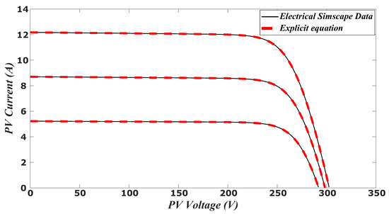 Figure 3 and Figure 4 show the accuracy of the proposed model compared with the data available in the Matlab Electrical Simscape model [20]. Figure 3 shows the curves for three different irradiance levels (600 W/m, 1000 W/m and 1400 W/m) with the same temperature (25 C) and Figure 4 shows the curves for three different temperatures (25 C, 50 C and 75 C) and the same irradiance (1000 W/m). The array is formed by 8-series connected 1Soltech 1STH-250-WH solar panels. For the implementation of the Lambert W function in this work, the built-in lambertw Matlab function has been used. It is worth noting that, for real-time implementation, approximations of the Lambert W function as References [21,22,23,24] are more suitable in order to reduce the computation time.