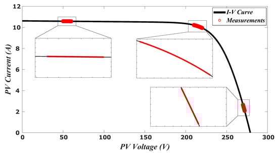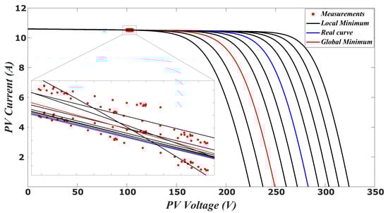 Traditionally, PV systems have been operated in order to extract the maximum available power employing MPPT algorithms. However, in some applications such as power smoothing or power reserve control, PV systems need to be operated in a deloaded mode. In these cases, it is important to estimate the PV system operating conditions, just to know the available power (MPP) or the entire curve. One approach to solve this issue is to apply nonlinear least squares curve fitting [25]. In this work, the curve fitting problem has been solved with the Levenberg-Marquardt method [26,27] by means of the Matlab embedded function lsqnonlin, based on Reference [28]. In nonlinear least squares problems, a set of m measurements (,) is fitted to a nonlinear model by minimizing the vertical distance between the measurements and the model as: