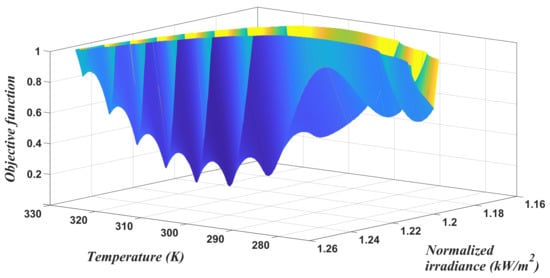 Figure 6, Figure 7 and Figure 8 represent the value of the objective function as a function of irradiance and temperature for the three sets of measurements of Figure 5. The ideal solution for the optimization problem would be a single global minimum. However, currently applied solutions are far from ideal.