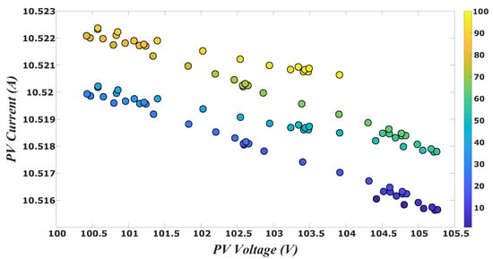 It is worth noting that, in the three cases analyzed, the measurements belong to a unique curve. But, in fluctuating weather conditions, irradiance, temperature, or both, vary between measurements. This case is illustrated in Figure 9, where irradiance is increasing and cell temperature is decreasing from the first measurement (purple) to the last measurement in the window (yellow).