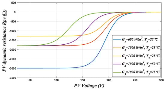 It can be seen from (24)–(26) that the plant model and the damping factor are affected by the dynamic resistance and, therefore, by the operating point of the PV system. To guarantee a robust control of the PV system, it is necessary to contemplate all the possible operating conditions. For illustration, Figure 12 represents the evolution of the dynamic resistance along the curve for five combinations of irradiance and temperature. As depicted, can take values in a wide range from −3000 to near 0 . In order to design a robust regulator, affine parameterization is applied.