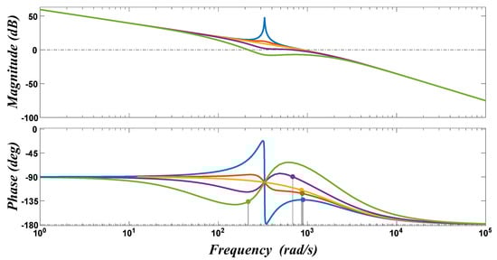 After the calculation of , the closed-loop robustness and stability must be verified. To do this, the Bode plot of the open loop transfer function can be used. Figure 13 shows Bode plots of the open-loop transfer function for five different operating conditions. The gain and phase margins guarantee a closed-loop stable operation for the five possible scenarios presented.