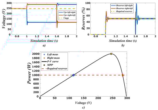The first study consists of a scenario with constant irradiance and temperature conditions. In this context, while operating at MPP, the command reserve is set to 50% at s. Then, at s, the operation side is shifted, so the PV system passes from left to right side operation and vice versa. The simulation compares the performance of the control system when the PV system operates on the left and on the right sides of the curve. Figure 14a illustrates the evolution of photovoltaic voltage for both cases (MPP-left-right and MPP-right-left) and the maximum power point voltage. As evidenced, in the MPP-left-right case, the photovoltaic voltage is below maximum power point voltage from s to s and above it from s to s. Figure 14b depicts the level of reserves achieved in both cases. According to the results, the control system is able to provide the required amount of reserves while operating on both sides of the power-voltage characteristic. This is confirmed in Figure 14c, where the actual curve at s is represented together with the MPP and both measurement windows.
