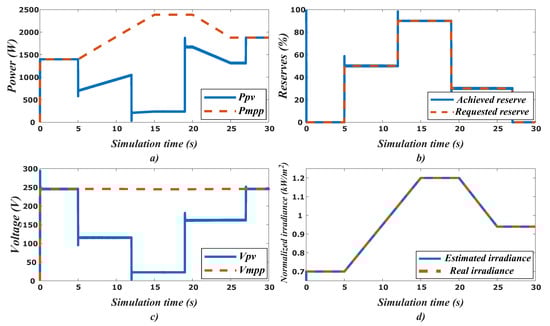 In this scenario, the irradiance and the required reserves vary while the temperature is kept constant. The PV system operates on the left part of the curve. Figure 15a shows the available power and the photovoltaic power over the simulation period. As can be seen in Figure 15b, the requested reserve is satisfied at every moment of the simulation. Operation on the left part of the curve is guaranteed, as shown in Figure 15c, because the photovoltaic voltage is always lower or equal to the maximum power point voltage. Finally, the irradiance evolution and estimation are represented in Figure 15d. Despite the discharge level, the proposed estimation method shows an efficient performance.