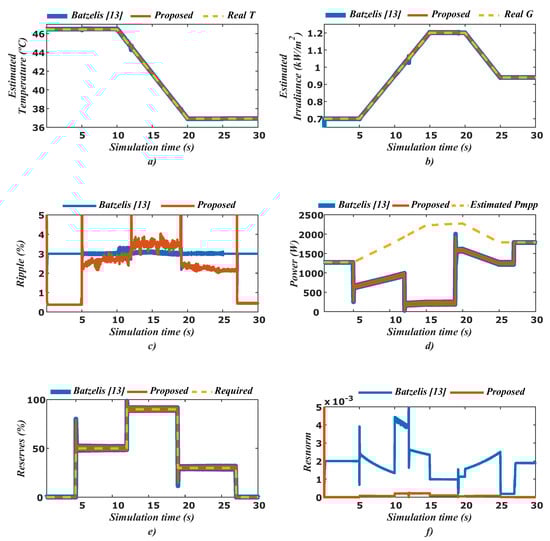 Case Study #3 compares the proposed method with the one presented in Reference [13]. The temperature, irradiance and required reserve profiles have been replicated from the aforementioned work. The objective of this simulation is to get the PV system to provide the requested amount of reserves while operating on the right-hand side of the curve. Figure 16a,b illustrate the estimated temperature and irradiance by both methods and their real values. Figure 16c shows the evolution of the ripple for both strategies. As can be seen, while the Batzelis’ approach uses a ripple control to follow the ripple reference of 3%, the proposed methodology takes advantage of the inherited ripple. It should be pointed out that the inherited ripple is greater than the reference just in the case of a power reserve level of 90%, from s to s. However, when the PV system operates at its maximum available power point, from s to s and from s to s, the inherited ripple is very low, reducing power and voltage fluctuations. Figure 16d depicts the power evolution along the simulation. As evidenced, the Batzelis’ and proposed methods have the same behavior. Figure 16e illustrates the requested power reserves and the one achieved by both methods. As it is clear, both strategies are able to follow the power reserve command. Finally, Figure 16f shows the squared 2-norm of the residual as a result of the curve fitting process. According to this result, it seems that the objective function proposed in this paper is more suitable than the one of Batzelis’ proposal.