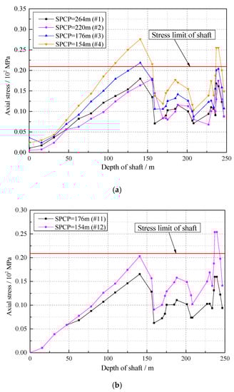 When the backfill ratio is higher than 0%, due to the supporting effect of solid backfilling material on overlying strata, the movement of overlying strata is more moderated. Therefore, prior to the shafts being damaged, the change of the shafts axial stress is small. Therefore, for the schemes where the backfill ratios are not 0% (#9–#32), this paper only lists the results that the axial stress is obviously changed during the excavation process. The axial compressive stress judging the shaft damaged is 21.3 MPa. The depth profiles of axial stress of the Baishan shafts at different backfill ratios is shown in Figure 5.