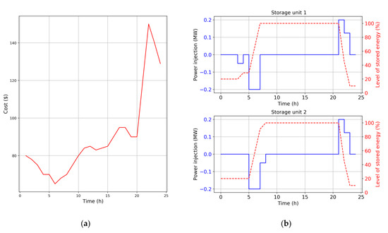 Analogously, to evaluate the impact of the supply cost profile on the scheduling of energy storage units, Figure 5b depicts the results obtained for the second scenario considering the cost of the energy supply illustrated in Figure 5a. Unlike results obtained from the original second scenario, in this subscenario, storage units carried out arbitrage actions by charging in periods with lower costs (time periods 5–7) and discharging in periods with higher costs (time periods 21 and 22).