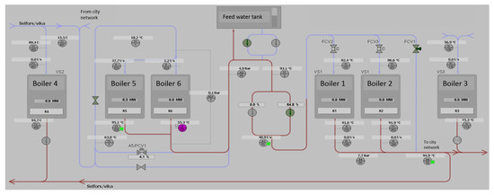 If the water temperature obtained from boilers 5 and 6 drops below the desired supply temperature level, peak heating boilers (1–4) are used. All the boilers are equipped with energy meters, and the DH demand in the network is thus calculated as
