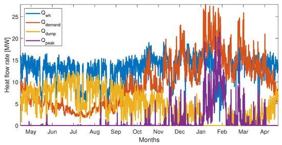 Data for hourly average waste heat available (), heat demand, peak heating and dumped heat () from May 2018 to April 2019.