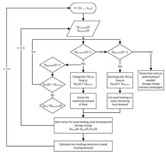 In the case of a constant, predictable source, the TES tank is usually dimensioned from the basis of load data, see, e.g., [7,12,13]. In the present case, with varying availability of heat, the peak reduction potential of a tank with certain size was calculated using hourly average data for heat flow rates for peak heating and heat dumping using an iterative approach, inspired by [14]. A flow chart of the approach, implemented in MATLAB, is shown in Figure 3. The tank volume was varied from 1000 to 5000 m in steps of 1000 m, and the storage capacity for each tank size was calculated as