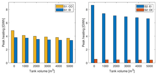 Figure 5 shows the total annual peak heating per source for the two different scenarios as a function of tank size. In Scenario 1, applying a TES tank with a small volume has little effect on the electricity use, as the remaining peak heating with oil is allocated to electricity, as explained in Section 2.3. With increasing tank size, however, a clear reduction in both CO and electricity use is visible, with a reduction of up to 11% in electricity and 24% in CO use with a 5000 m tank. In Scenario 2, the share of peak heating covered by oil is small and thus also the reduction in oil use is less visible than reduction in electricity use. Nevertheless, the reduction with a 5000 m tank is 20% for oil and 23% for electricity.