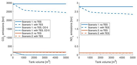 Figure 6 shows the reduction in CO and NO emissions as a function of tank size for both the scenarios. For CO emissions in Scenario 1, both the present situation with an emission factor of 0 for CO and a future scenario with an emission factor of 0.574 kg/kWh are shown (see Table 2). With zero emission factor for CO, the emissions result solely from the use of oil, and are on the same level as in Scenario 2 when no TES is used. With introduction of a TES tank, the emissions are reduced to 0 in Scenario 1 as the use of oil is allocated to electricity (see Section 2.3). For Scenario 2, introducing a TES tank has generally a negligible effect on the emissions, as the electricity used by the DH supplier is 100% renewable, and the share of oil in peak heating is minimal.