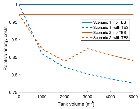 Figure 7 shows the relative reduction in peak heating costs, considering energy costs alone. The initial peak heating costs are slightly higher in Scenario 1; thus, the reduction in costs resulting from the implementation of a TES tank is also higher. The reduction in costs is in both scenarios clearly highest for the first step from no TES to implementing a tank with a volume of 1000 m. For Scenario 2, the costs increase with tank sizes larger than 2000 m, which results from the applied stepwise increase in electricity price as explained in Section 2.3: with a 2000 m tank, the annual electricity demand is slightly above 7000 MWh, while, with a 3000 m tank, the annual electricity demand drops to just below 7000 MWh, resulting in an increase in electricity price and consequently higher energy costs. When the tank size is increased further, the electricity demand continues to decrease while the price stays at the same level, resulting in a decrease in the relative energy costs again.