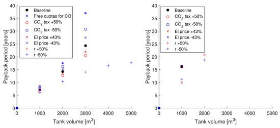 Apart from the interest rate, the payback period for Scenario 1 is most sensitive to the emission factor for CO, and thereafter to the CO tax. The payback period is nevertheless little affected by these parameters at the smallest tank size of 1000 m, which appears to be the overall best option based on the results in Figure 5, Figure 6, Figure 7 and Figure 8 and Table 3. For Scenario 2, the payback period is very sensitive to the electricity prices, and hardly affected by the remaining two parameters.