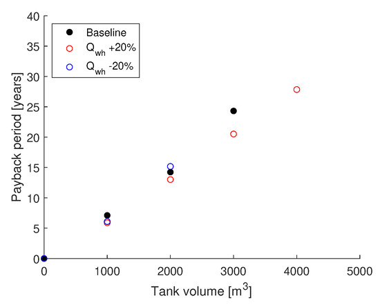 Figure 8 presents the results from the sensitivity analysis with respect to the economic parameters. For both scenarios, the payback period is strongly affected by the interest rate. For scenario 2, the investment is not economically viable (i.e., ) for tank sizes larger than 1000 m, unless the interest rate is reduced by 50%; and, for scenario 1, this applies for tank sizes larger than 3000 m.