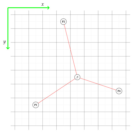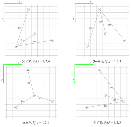 The center nodal point () search is based on calculating the length of the branches for all possible combinations of point connections, as shown in Figure 7.