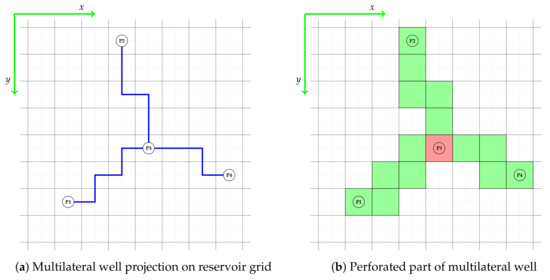 The end-point multilateral well optimization model is based on the reservoir numerical simulator. The basic principles require dividing the reservoir into a series of cells. Each cell of the reservoir model has discrete coordinates related to the block center point, as presented in Figure 5.