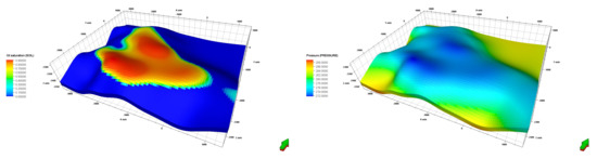 Distributions of oil saturation (left) and initial pressure (right) in the reservoir model. Source: AGH UST Drilling Oil and Gas Faculty synthetic benchmark model.