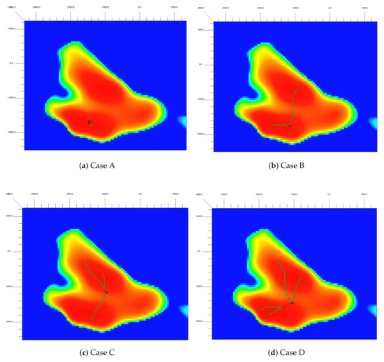 Small changes of the end-point positions can change the project profitability, increase the water production rate, accelerate water breakthrough, and increase the utilization of reservoir energy. The result of the optimization algorithm, multilateral trajectories, was implemented on a numerical grid, which is presented in Figure 18 and Figure 19. The objective function for wells with a complex trajectory takes into account their length; therefore, the results obtained should be treated as optimal in terms of location and length. A list of the lengths of individual well branches is shown in Table 6. Considering the total well length, GA and PSO propose the same length for Case A. PSO promotes a shorter total well length pattern, which can be addressed as drilling risk mitigation.