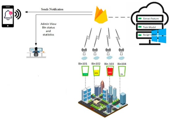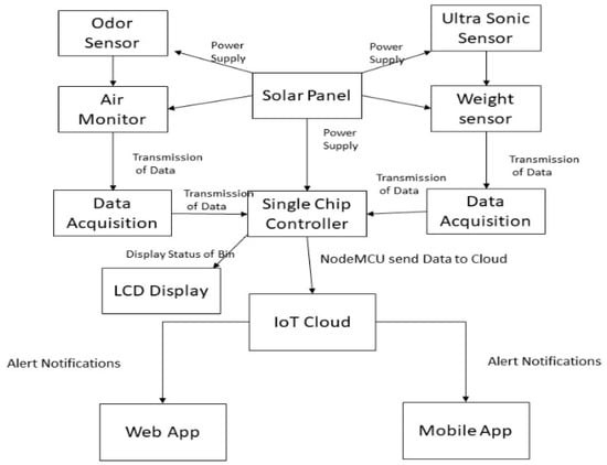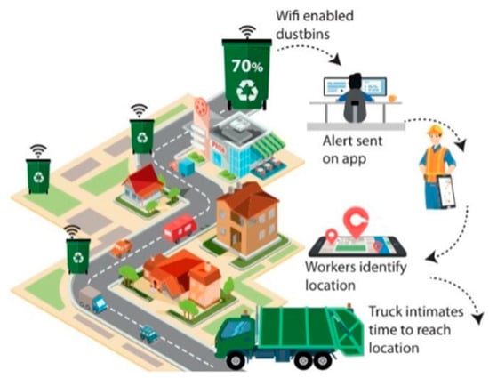 The internet plays a very significant role in the current era as technology advances. Current evolutions in modern technology, like the Internet of Things (IoT), have had a remarkable effect on our daily life. IoT technologies have improved the quality of life by understanding the surrounding environment through modernization. This has introduced the concept of smart cities by simplifying the communication between humans and things. The expansion of the IoT significantly contributes to the boosting of our life in different sectors like smart homes, smart cities, smart grids, smart wearables, and smart industries. IoT architecture performs a key role in communication devices. However, the core interest of researchers towards the IoT is the current, overwhelming increase in smart device utilization. By empowering the IoT, we can more efficiently develop vigorous smart applications like smart homes, smart cities, smart campuses, smart waters, and smart dustbins. One of the most promising IoT applications is in garbage collection systems. In the domain of smart cities, the monitoring and management of waste is a primary issue [1,2]. The IoT represents the most exciting revolution to monitor and manage waste information using real-time applications from any place at any time [3,4]. Nowadays, modern applications and related smart devices utilize more sensors than ever before [5]. Remotely monitoring and managing can be made much more efficient via the implementation of hardware and software technology.