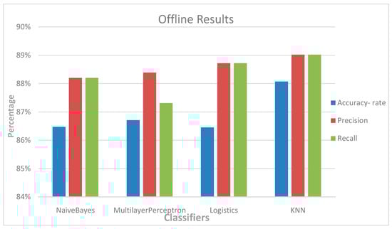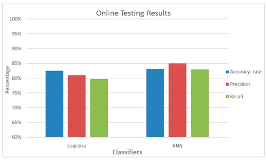 The results of the training and evaluation of different machine learning classifiers are shown in Figure 6. Accuracy, precision, and recall were generated using Equations (2)–(4).