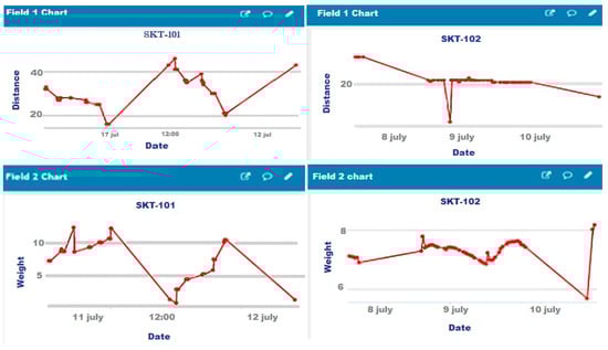 This trained model was then tested in a real-time environment by fetching data from the Firebase data server and made predictions of bin status based on the trained mode. The real-time streaming of two smart bins for trash level and weight are shown in Figure 7. In this way, our trained model was tested in real-time scenarios. The KNN model had a recall of 0.89, which meant that the model well-predicted the status of the bin. The model had a remarkable precision, thus indicating less FP, which meant fewer wrong alerts were generated. The other three models had mostly the same results. The KNN performed well when used in real-time scenarios. The machine learning model is unable to handle the faulty inputs and unknown states, so the alert message is produced by using probabilistic model. In a real-time environment, the results showed that the KNN model performed better predictions regarding the status of the bin, as shown in Figure 8.