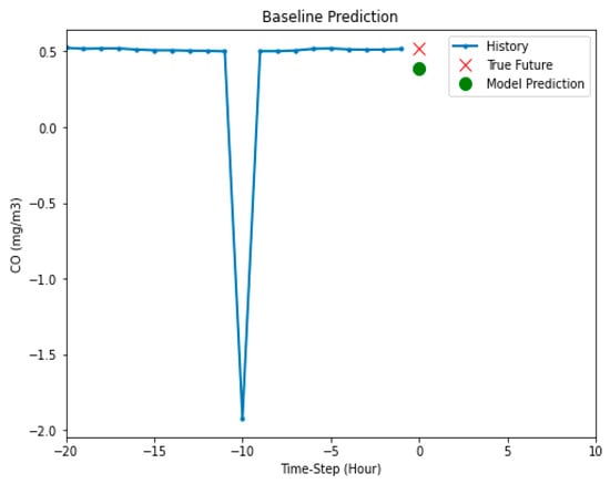 The means and standard deviation were calculated to perform the standardization of the dataset. Before training the model, we implemented a baseline model. For a given input point, the baseline method looked at all the history and predicted the next point to be the average of the last 20 observations. The prediction performed by the system is shown in Figure 9, where the blue line represents the previous instant, the model prediction is shown in the green circle, and the actual data received at that particular time slot are shown as the true future.