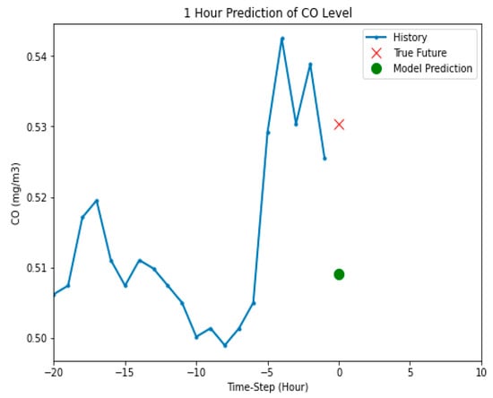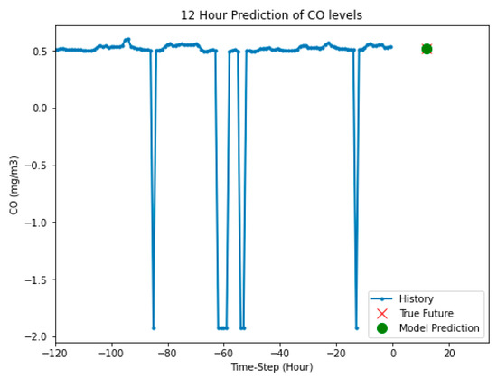 The LSTM model configurations were changed to train it for the prediction of gas levels in the next 12 h time slots. The model was trained on five days data of hourly collected gas concentration levels for predicting the next level of the gas in the next 12 h. The output of the model is shown in Figure 11. The model prediction was further away from instance zero, which means that it presented the future value of the gas level. The predicted future and true future overlap in the graph, which means that the accuracy of prediction was improved when the LSTM model was trained on a larger dataset.