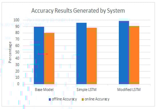The accuracy of the baseline, simple LSTM, and modified LSTM models was generated while testing them on the offline and real-time datasets. The accuracy of these three approaches is shown in Figure 12. It was observed that the Modified LSTM model could achieve a 0.90 accuracy while testing in real-time scenarios. From the graph, it can be shown that a simple baseline model achieves an accuracy of around 0.8 in real-time scenarios. The accuracy of the system depends on concentration of gases and other external factors. The LSTM model could consider changes caused by these elements along with an improved accuracy of 0.9 in real-time scenarios. Figure 9 shows the concentration of CO using the baseline model. Figure 10 and Figure 11 show the forecasting of CO concentration in the next 1 and 12 h, respectively.