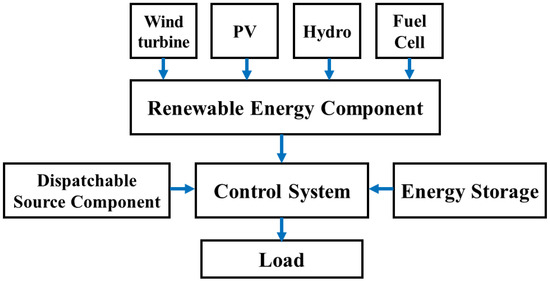 Hybrid energy systems (HESs) generate electricity from multiple energy sources that complement each other. Historically, the global efforts to research and utilize these types of systems increased after the oil crisis in the early 1970s; since then, the number of HES installations has experienced a strong upsurge [12]. Generally, HESs incorporate one or more renewable energy sources (e.g., solar, wind, hydro, fuel cell), a conventional energy source (e.g., microturbines, gas turbines, and internal combustion engines), and an energy storage system, such as batteries, compressed-air energy storage (CAES) systems, flywheels, ultracapacitors, and superconducting magnetic energy storage (SMES) systems [13,14]. Furthermore, their configuration varies depending on their potential application, the availability of local resources, and the energy demand in a considered area. The basic components of an HES are shown in Figure 1.