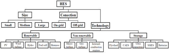 In the literature, HESs have been classified based on several criteria, such as types of technology, type of energy produced, capacity size, and level of integration with the grid [15]. Figure 2 shows an overview of the HES classifications. There are two main classifications of HESs on the basis of their interaction with the distribution grid. An HES that is connected to the distribution grid and that can buy (import) or sell (export) electricity is called an on-grid system. Conversely, an HES that is located in a remote area and therefore not connected to the distribution grid is called an off-grid system, also referred to as autonomous, standalone, or islandic. Another common classification of HESs is based on the criterion of installed capacity. HESs range from small-scale units with a few kilowatts to large-scale systems with enough capacity to power entire communities or industrial establishments. Small-scale hybrid energy systems have an installed capacity of less than 5 kW and are used for typical loads of remote homes, telecommunication systems, or meteorological stations. Medium-scale HESs have a capacity in the range of 5 to 100 kW and are used to electrify small communities in rural areas, isles, or mid-sized utilities. Lastly, large-scale HESs have an installed capacity greater than 100 kW and, in most cases, are connected to the distribution grid or the national grid [16].