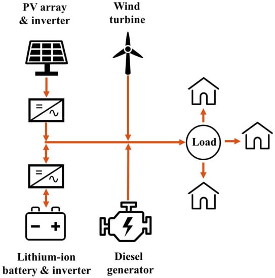 Today, the world faces unprecedented environmental and economic challenges due to the unsustainable use of natural resources. The growth of the world population, the rising global energy demand, the depletion of conventional energy sources, and the volatility of fossil fuel prices have triggered the enthusiastic search for new alternative energy sources [1]. Renewable energy sources (RESs) have become an essential and promising option to face the abovementioned challenges [2,3,4]. As a result, in the last two decades, researchers, decision-makers, and industry leaders have prioritized the technological development and widespread deployment of low-carbon energy technologies [5]. Decentralized renewable units comprised of technologies such as wind turbines, photovoltaic (PV) solar panels, and micro-hydropower have been proposed as suitable solutions for a more sustainable and clean electricity supply [6,7,8]. However, despite the advantages of renewable energy technologies, the generation of electricity from RESs presents numerous challenges to their deployment, including policy barriers, technological barriers (e.g., intermittency and uncertainty due to its dependence on meteorological conditions, wind speed, or sunlight availability), and economic and financial barriers (e.g., high upfront costs, capital and operation costs) [4,9,10]. Hence, to provide a reliable and adequate electricity supply, there is a need for the hybridization of RESs with conventional generating sources [11].