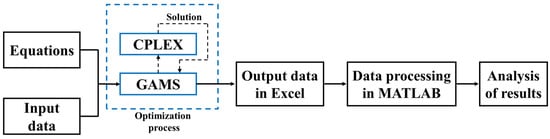 A flowchart of the methodological framework proposed in this paper is provided in Figure 5. It shows the importance of the construction of the mathematical equations and the input data (economic, meteorological, and technical data of the system) on the modeling and design of hybrid energy systems. These two elements are essential for the optimization process. The mathematical model was implemented in General Algebraic Modeling System (GAMS) 27.1.0 and solved using the CPLEX 12.9.0.0 solver [51]. The model’s output was exported to a spreadsheet software, and MATLAB 2019a was employed for data structuring, postprocessing, and plotting. Finally, the numerical and graphical results of the optimization process were compiled and analyzed.