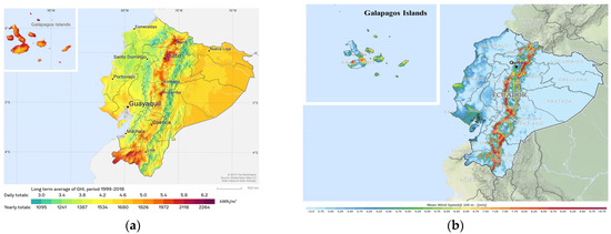 Renewable energy potential in Ecuador: (a) Global Horizontal Irradiation map. Adapted from © 2019 The World Bank, Source: Global Solar Atlas 2.0, Solar resource data: Solargis [60]; (b) Mean wind speed map. Adapted from © 2019 Technical University of Denmark, Source: Global Wind Atlas 3.0, Wind resource data: Vortex [61].