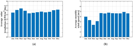 Meteorological conditions at the considered site in the Galapagos province: (a) average daily solar irradiation; (b) average monthly wind speeds.