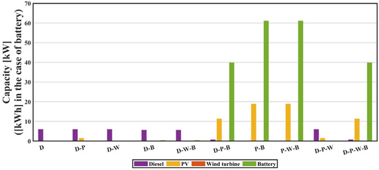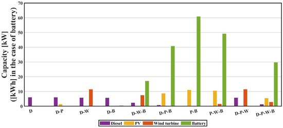 Table 5 summarizes the outputs of the model for the hybrid energy project located in the Galapagos province. The results show that a diesel–PV–wind–battery system leads to the lowest value of LCOE (0.30 $/kWh) and a total life cycle cost of approximately $36,352. The system consists of a 1.27 kW diesel generator, a 5.46 kW PV array, a 2.84 kW wind turbine, and a 29.72 kWh battery. In this system, renewable energy sources contribute nearly 95% (63% PV and 32% wind turbine) of the total power generation, while the diesel generator meets the remaining 5%. It is worth noting that in 2007, the Ecuadorian government launched the “Zero Fossil Fuels” initiative in the Galapagos Islands [54], a program aimed at decreasing the use of fossil fuels in electricity generation. Therefore, even though a PV–wind–battery configuration does not lead to the lowest LCOE (0.36 $/kWh) due to its high investment costs, it is reasonable to assume that this configuration should be considered as the optimal case for the Galapagos Islands. Table 5 also shows the annual CO2 emissions from the combustion of diesel fuel for all the configurations analyzed. As can be seen from the table, the hybridization of energy sources has a substantial impact on the TLCC and their respective emissions. In comparison to the diesel-only system, the diesel–PV–wind–battery configuration emitted nearly 13 times less CO2. Figure 8 shows the component capacities of the different system configurations.
