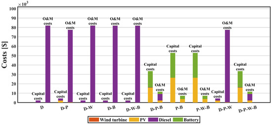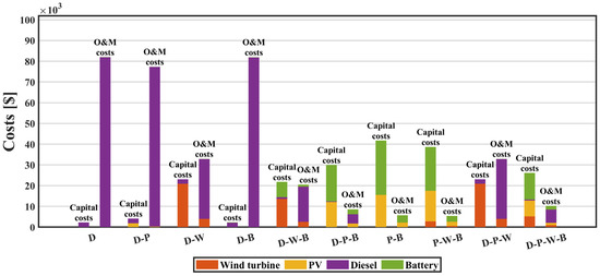 Figure 9 presents the estimates of the TLCCs for each system configuration, including capital and O&M costs. In the case of a standalone diesel generator, capital costs represent 2.6% of the TLCC, and the remaining 97.4% is related to fuel and maintenance costs. For the configuration comprised of a diesel generator and PV–wind–battery subsystems, the majority of the capital costs are split between the battery, PV module, and wind turbine (49%, 29.2%, and 19.9%), while the fueling costs of the diesel generator represent the largest share of O&M costs (62.7%). Such results highlight the importance of RESs and their significant impact on the TLCC of a hybrid energy system.