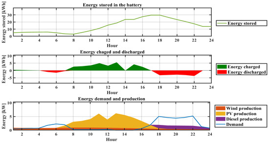 The model proposed in this study is capable of providing an optimal operating schedule for the considered technologies in addition to determining the appropriate capacity of each component. Figure 10 illustrates the optimal power generation of the Diesel–PV–Wind–Battery (D-P-W-B) system configuration for 24 h. It can be observed that the solar-powered subsystem can generate electricity between 6 AM and 6 PM, with its highest output in the middle of this period. Most of the surplus energy is stored in the battery, which is later discharged and backed up by the diesel generator. The figure shows the battery storage depth of discharge, which, in the case of this study, was set to be 90%.