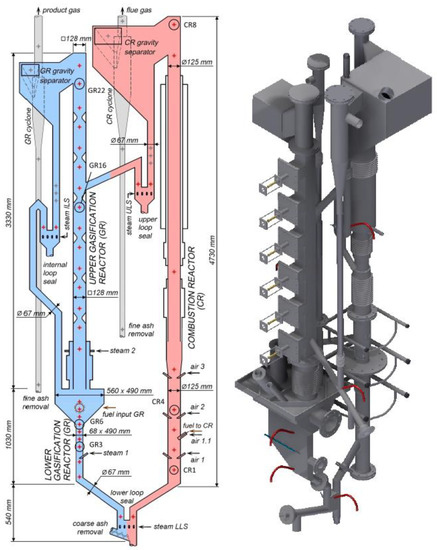 Scheme and 3Ddrawing of the 100 kW dual fluidized bed (DFB) steam gasification pilot plant [23].